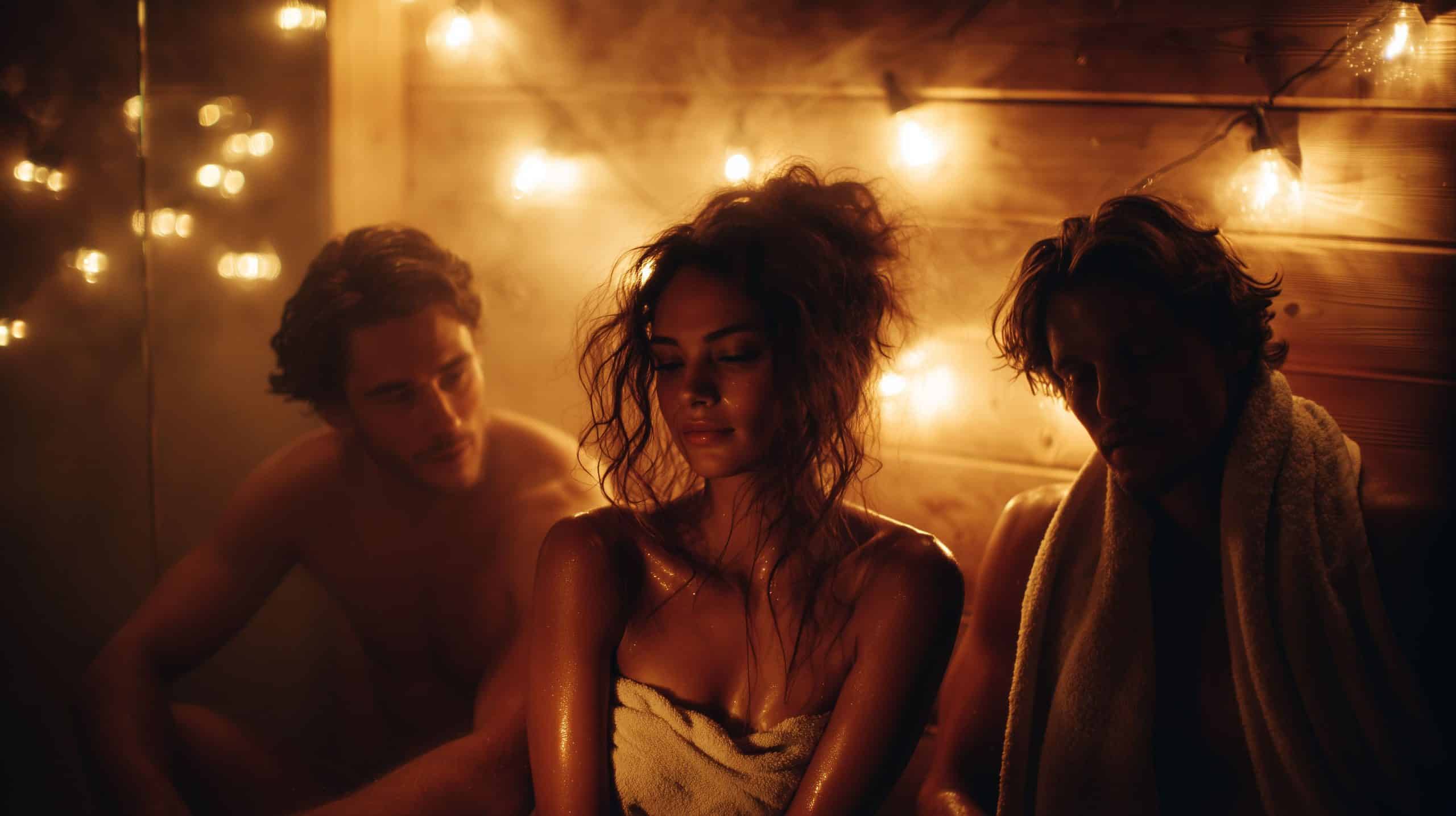 Vi ble liggende i badstua til svetten og sæden blandet seg på huden min. Så dusjet vi sammen – tre kropper under det varme vannet, hender som fortsatt utforsket, munner som fortsatt smakte.